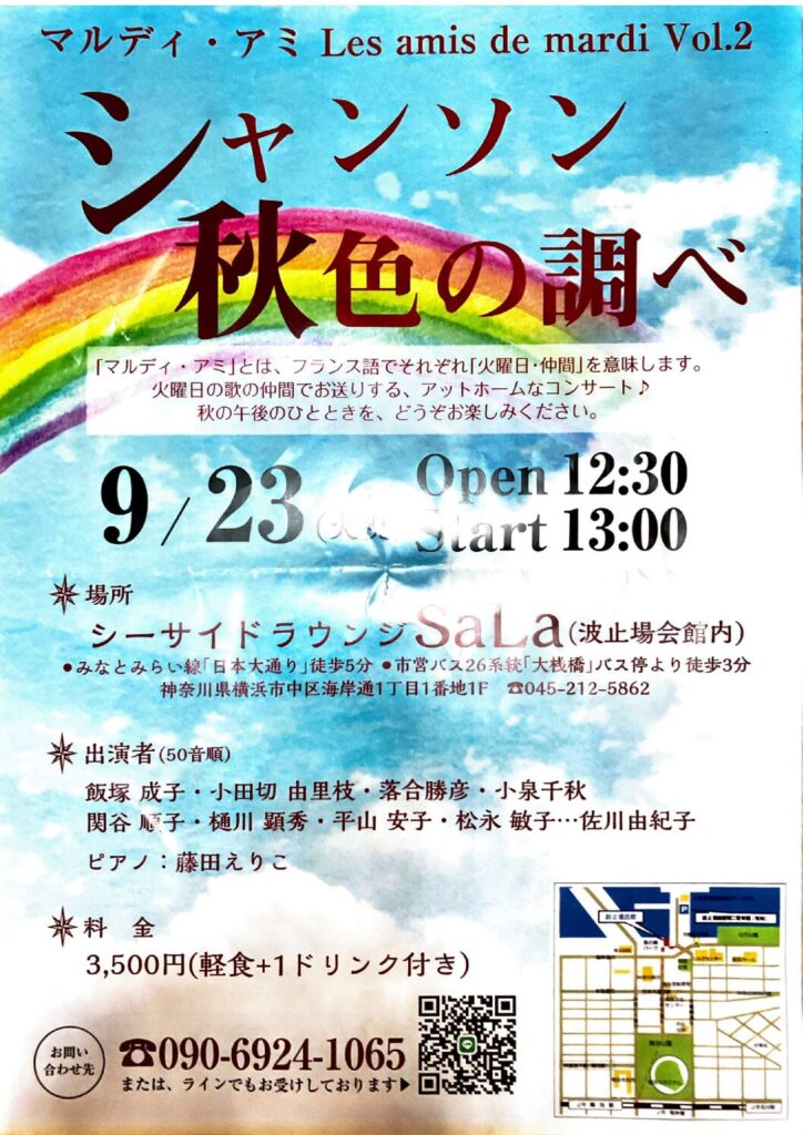 マルディ・アミ Les amis de mardi Vol.2 2025 10/01 お知らせ 2025年10月1日 9月30日、波止場会館にあるシーサイドラウンジSalaにてエバーグリーン火曜日のピアノデーのメンバーによるコンサートが開催されました。日頃の練習の成果を50名を超えるお客様の前で披露。それぞれの個性が発揮された素晴らしいコンサートとなりました。 お知らせ よかったらシェアしてね! URLをコピーしました! URLをコピーしました! 洋光台ふれあいサロン 2025年9月9日 関連記事 洋光台ふれあいサロン 2025年9月9日 2025年9月12日 根岸星の子保育園での音楽会 2025年4月3日 デュエットカーニバルに出演しました 2025年3月5日 Vol 5 エバーグリーン音楽祭 2025年2月25日 フレイル予防 健康食とオーラルケア 2024年12月16日 汲沢ふれあい午後カフェに歌いに行きました。 2024年11月25日 東京ビックサイト、アン カオル 2024年11月16日 初心者麻雀教室 2024年11月15日